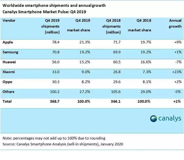 数据会说话。Canalys公布了2019年第四季度以及全年的全球智能手机市场报告显示,第四季度全球智能手机出货量达到3.69亿台,同比增长1%。相对于苹果、三星增长的态势,华为是2019年销售量减少的手机企业之一。