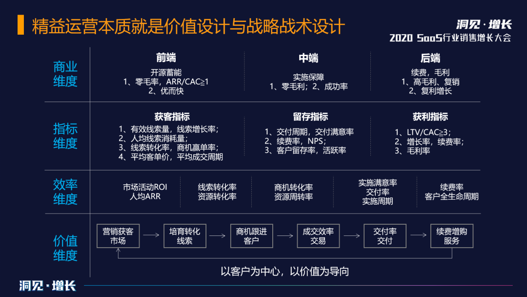 营销增长维度,从精益和效率增长的角度,应该是模型性增长和可复制性增长。从精益增长上来讲,真正有效率的公司应该从前端市场端就建立自己的效率模型,从获客成交周期到获客成本及毛利,都要看自己是否建立了有效的模型。后端强调盈利即毛利的策略,从而让公司健康、持续的增长。