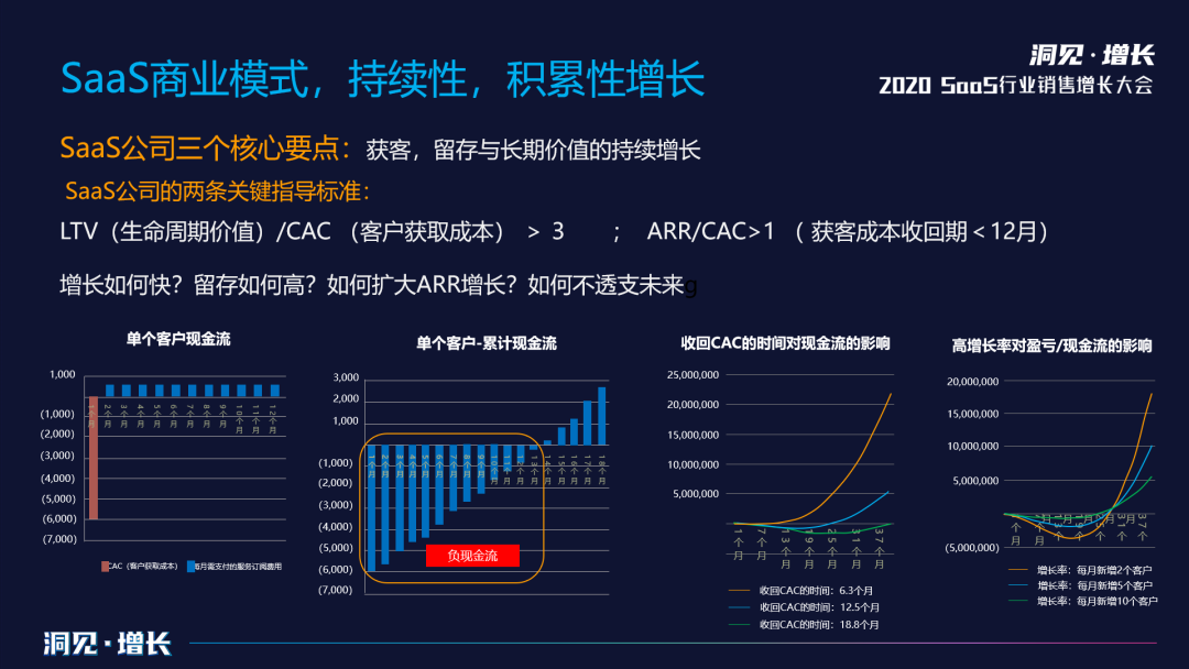 SaaS行业强调的是持续性、积累性,用户的生命周期足够长、持续价值创造能力足够高。因此,获客、客户留存,以及长期价值的创造是其中的3个关键点,那么围绕着三个关键点展开对增长的思考是非常重要的。比如,如何让客户诉求得到真正满足?如何不透支未来?等等。