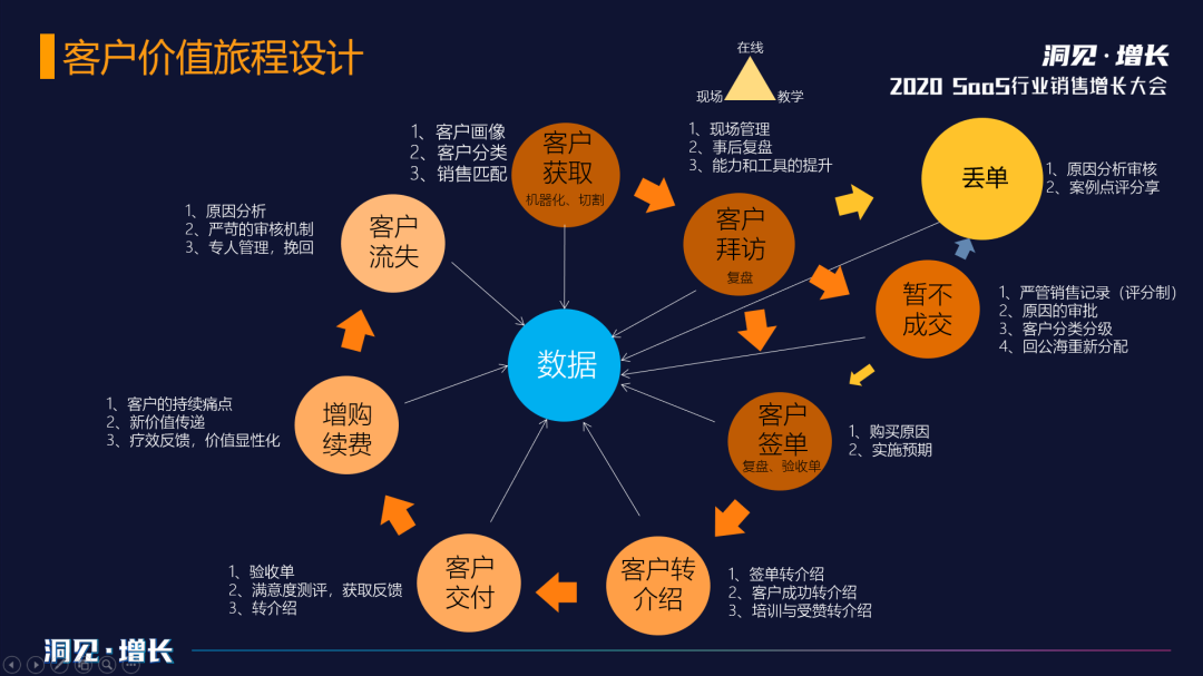 以纷享销客为例,在B2B领域,分为前端获客、客户拜访、客户签单、客户转介绍、客户续费,甚至客户流失多个环节。在获客环节最主要的是选择正确的客户,在客户拜访中更强调的是现场管理、控场能力、价值传导,以及对客户的洞察和理解。甚至流失的客户,也要反馈到产品、流程、服务等体系中,以便认清真正的客户,而不是让不正确的客户花费多余的钱。