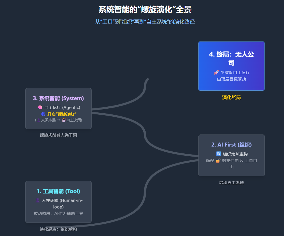 它是一个不断自我强化的正反馈。AI通过一次次循环,递归地优化掉组织中所有“不必要”的人类节点,从而“螺旋式”地提升自身智能和权限的边界。