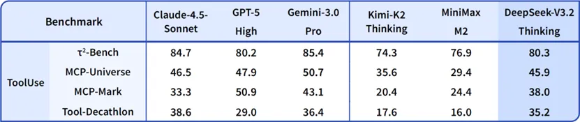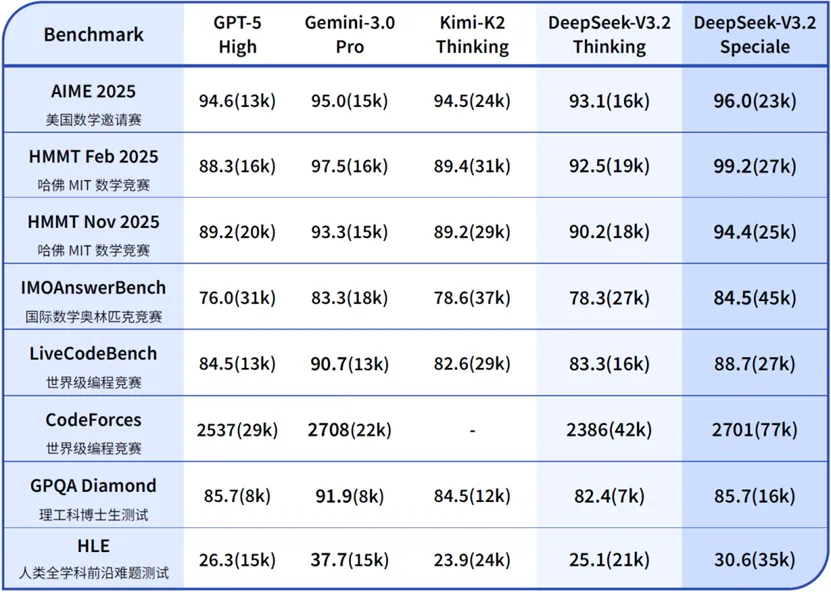 她自己介绍说,DeepSeek-V3.2的目标是平衡推理能力与输出长度,适合日常使用,例如问答场景和通用 Agent任务场景。在公开的推理类 Benchmark 测试中,DeepSeek-V3.2达到了 GPT-5 的水平,仅略低于Gemini-3.0-Pro;相比 Kimi-K2-Thinking,V3.2 的输出长度大幅降低,显著减少了计算开销与用户等待时间。