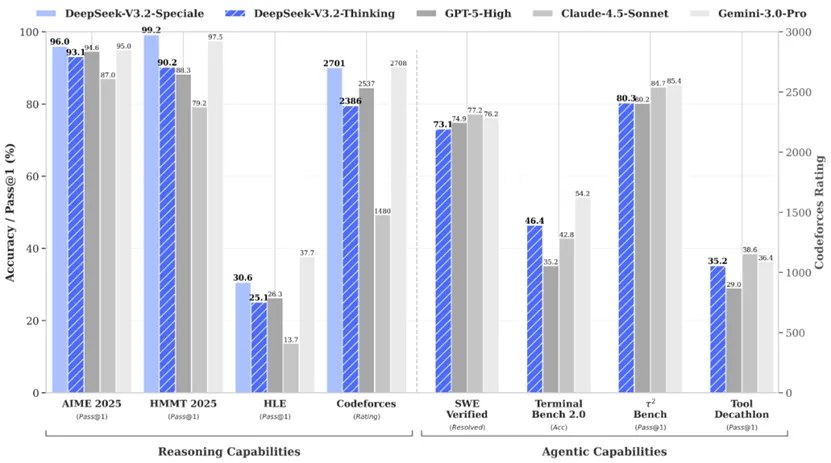 DeepSeek-V3.2-Speciale的目标是将开源模型的推理能力推向极致,探索模型能力的边界。V3.2-Speciale是 DeepSeek-V3.2 的长思考增强版,同时结合了DeepSeek-Math-V2 的定理证明能力。该模型具备出色的指令跟随、严谨的数学证明与逻辑验证能力,在主流推理基准测试上的性能表现媲美 Gemini-3.0-Pro(见表1)。
