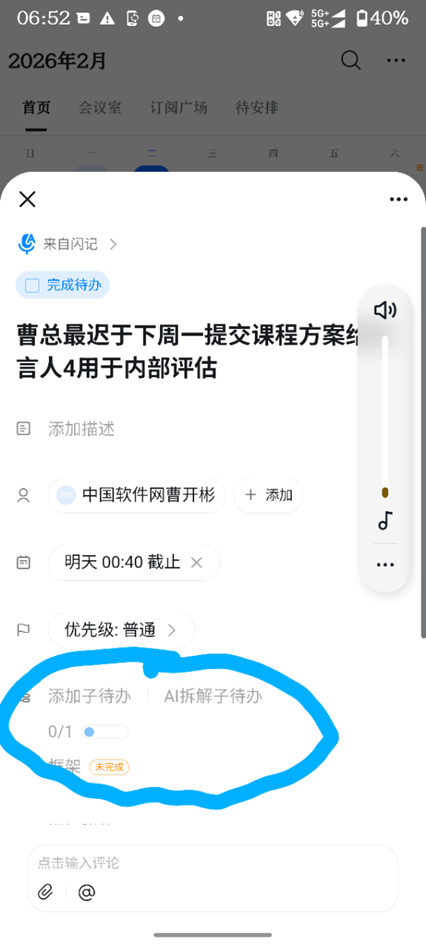更绝的是,钉钉这个日程安排,还能进一步细化,居然可以做添加子待办,把这个任务进行拆解、细化安排。并且,它还可以用AI、用大模型自动帮你进行任务拆解。这个太赞了。