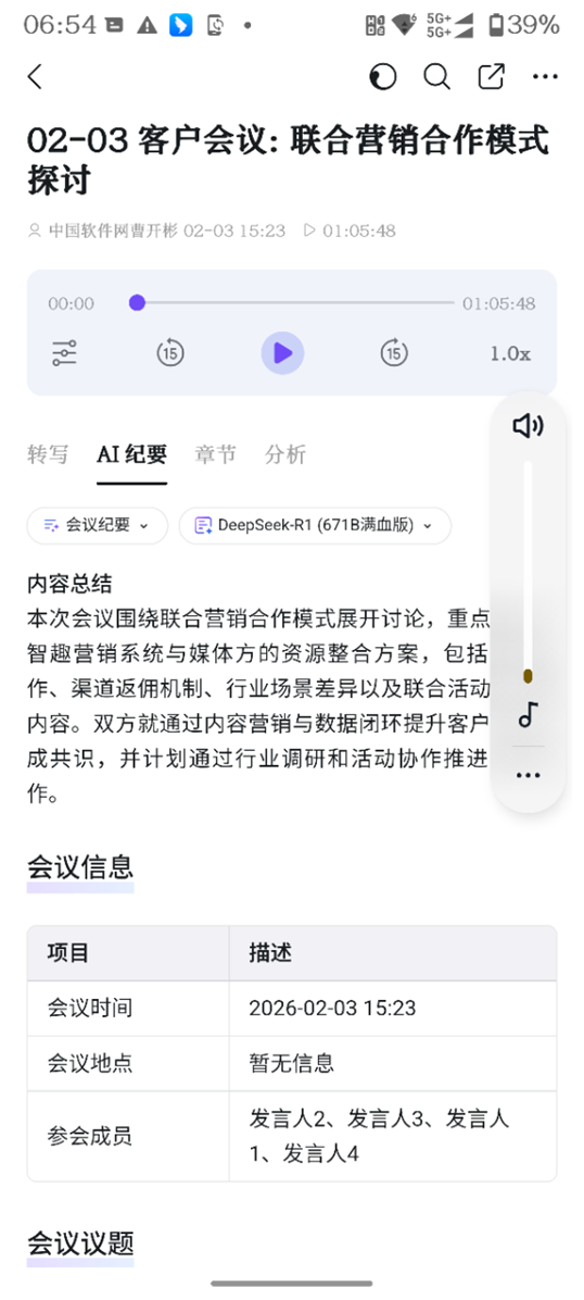 录音文件上传后,我点击,奇迹出现了:钉钉自动生成了AI纪要。也有实际录音的完整文字转写,也有按章节来总结的会议内容。