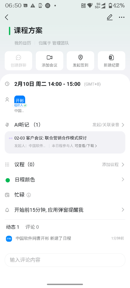 我们第一次用的工作场景是这样的:2月3日下午15:30~16:00,我们和一个客户约好开视频会议,就双方联合开展AI精准内容吸引销售线索培训项目做一次沟通。