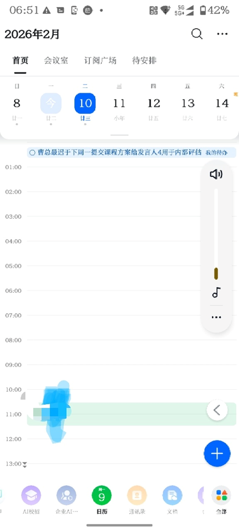 更让人惊喜的还在后面,我在日程安排中发现,钉钉AI居然自动地将待办事项放到相应人员的日程安排里了!并且还在当天置了顶!