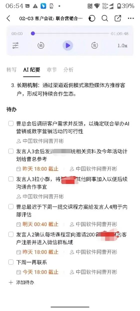 会议纪要部分有个小惊喜,它会列出本次会议后续要跟进的所有待办任务安排。和别家产品不一样的是,钉钉A1待办列的特别全面,几乎会议中提到的都列出来了。有一些我自己都忘了,它也列出来了。