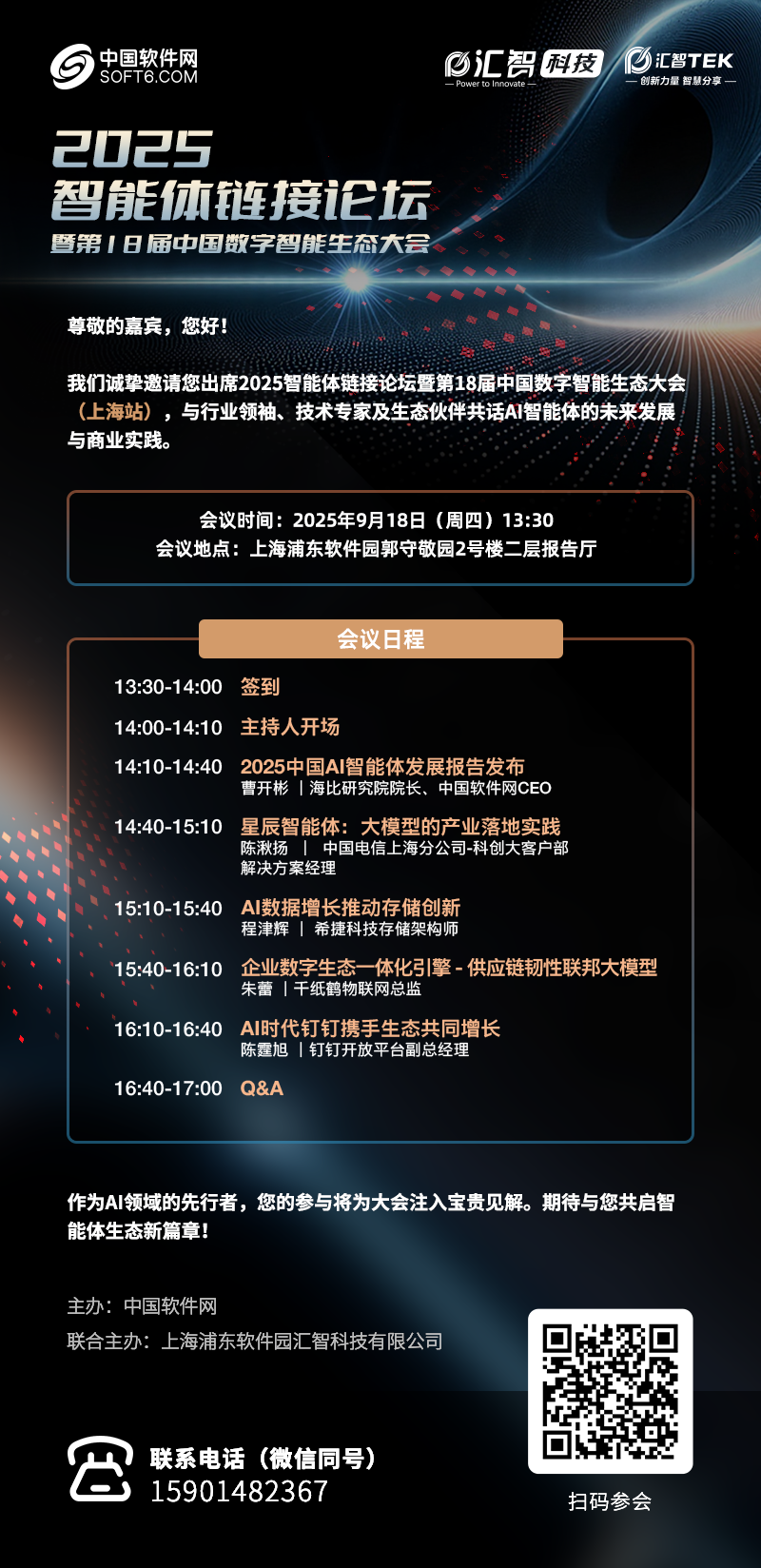 行业的发展需要有政策引导,也需要行业聚力。为了打通行业发展阻碍,广泛链接资源,搭建高效交流合作平台,促进人工智能重要发展载体——AI智能体的落地,助力好项目找到客户、资源和破局机会,同时也帮助有资源的人寻觅到真正靠谱的 AI 产品,由中国软件网、海比研究院主办,上海浦东软件园汇智科技有限公司联合主办的2025 智能体链接论坛暨第 18 届中国数字智能生态大会(上海站)即将于9月18日下午在上海浦东软件园郭守敬园2号楼二层报告厅正式启动!